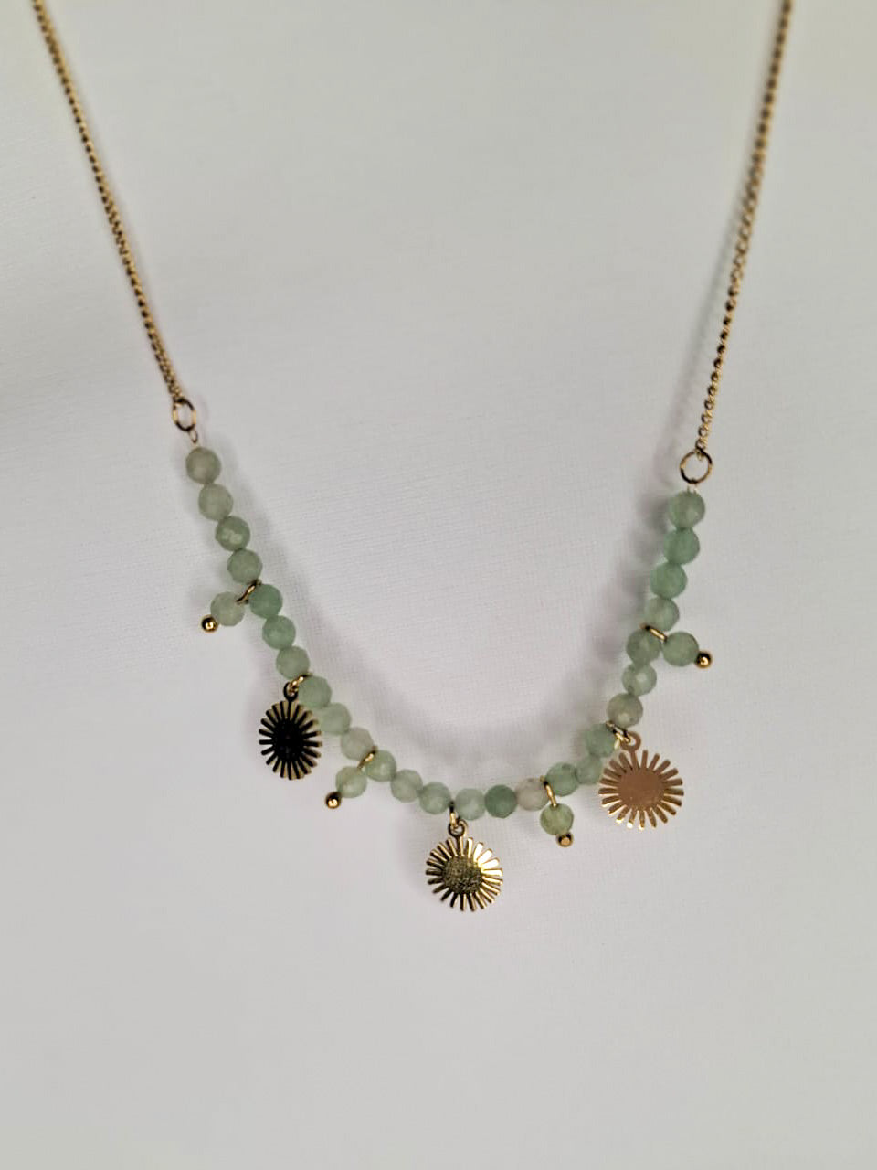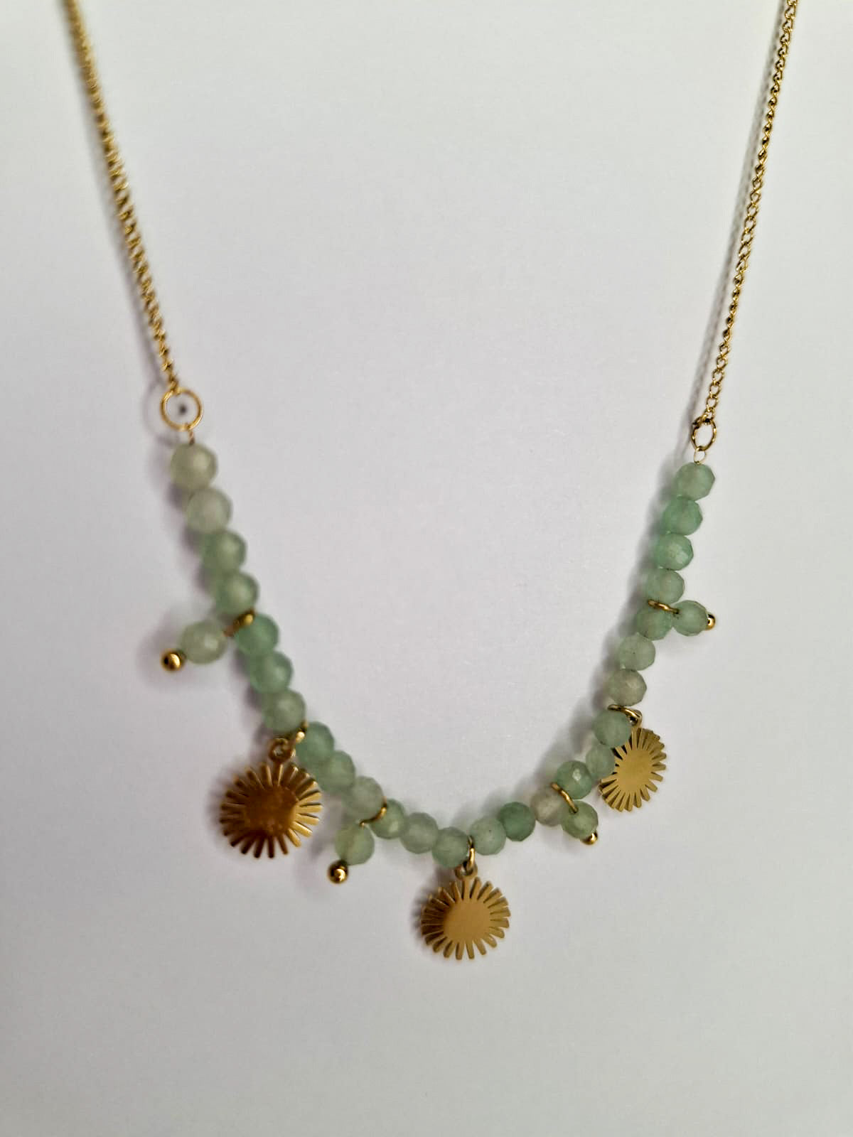 Este collar combina delicadas piedras verdes con pequeños soles dorados que iluminan sutilmente cada movimiento. Inspirado en la armonía de un jardín bañado por el sol, es una joya que refleja frescura, elegancia y vitalidad. Jardín Solar es ideal para mujeres que buscan florecer desde dentro, llevando su esencia con estilo y brillo propio. 💚